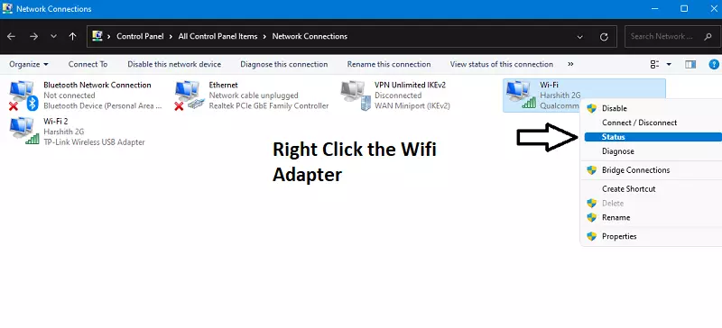 “Wifi Adaptörü”ne (PC'nize bağlı Wifi ağı) sağ tıklayın ve “Durum” seçeneğini seçin.