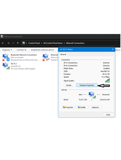 Bunu takiben, yeni bir pencere açmak için Kablosuz Özellikler düğmesini tıklayın.
