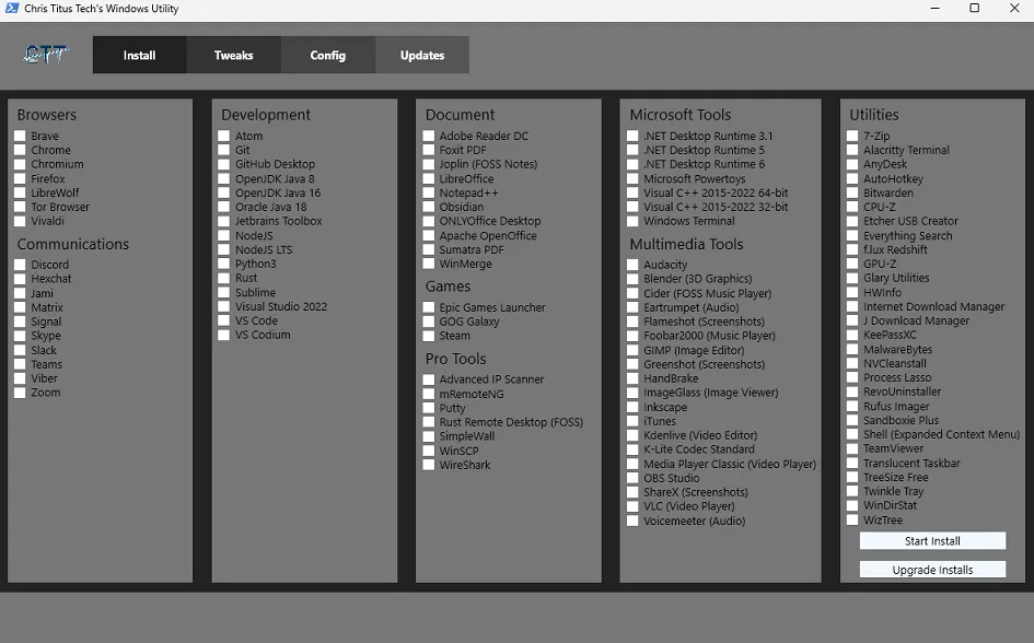 Komut dosyasını ilk kez çalıştırdığınızda, ilgilendiğiniz özelliklerin yanındaki kutuları kolayca işaretleyebileceğiniz dört sekmeli bir arayüz göreceksiniz. Yüklemeler, İnce Ayarlar, Yapılandırma ve Güncellemeler sağlanan dört sekmedir, çünkü işlevlerini doğru bir şekilde tanımlarlar.