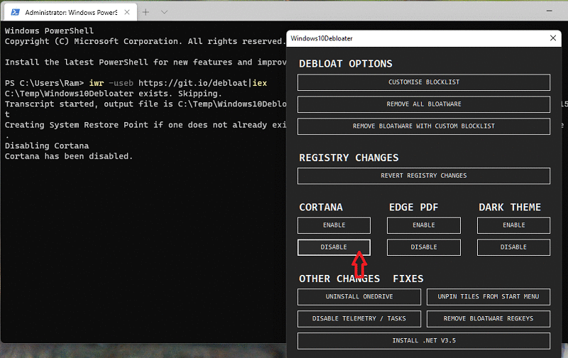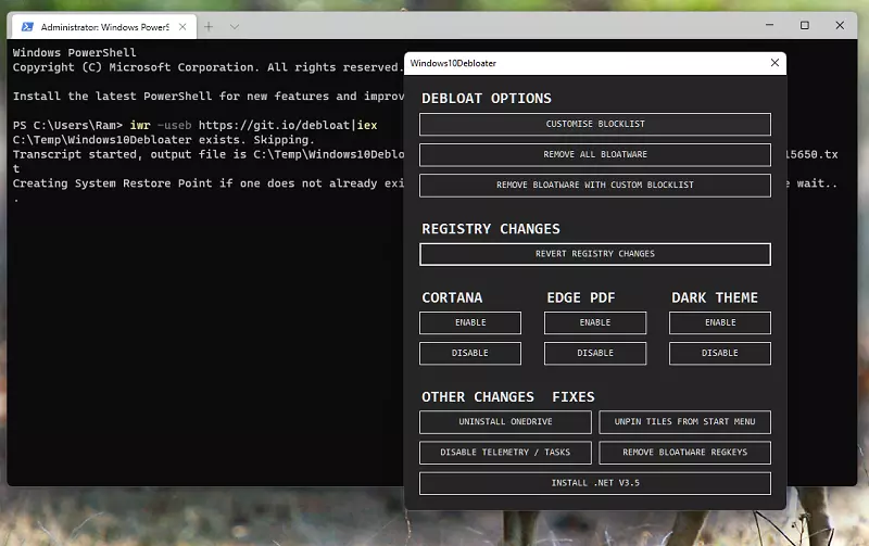 iwr -useb https://git.io/debloat|iexBu komut aynı zamanda bir Sistem Geri Yükleme Noktası oluşturarak bir şeyler ters giderse hızla önceki çalışan bir sürüme dönmenizi sağlar.