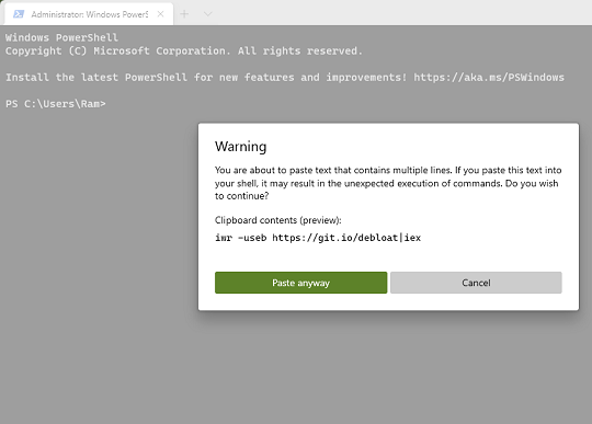 Aşağıdaki komutu kopyalayıp PowerShell penceresine yapıştırın. Bundan sonra Enter tuşuna basın. Debloater komut dosyasını otomatik olarak indirecek ve başlatacaktır.